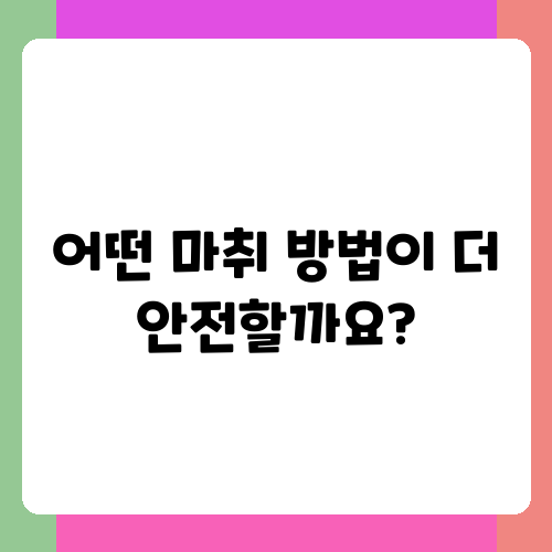 마취의 안전성은 환자의 건강 상태, 수술 종류, 그리고 마취 의사의 경험과 숙련도에 따라 달라집니다. 절대적으로 안전하다고 말할 수 있는 마취 방법은 없지만, 일반적으로 수면마취는 전신마취보다 부작용이 적다고 알려져 있습니다. 전신마취는 호흡기계 합병증이나 심혈관계 합병증의 위험이 있지만, 수면마취는 이러한 위험이 상대적으로 낮습니다. 하지만 수면마취의 경우 수술 부위에 따라 전신마취가 더 적합할 수도 있습니다. 수술 전에 담당 의사와 충분히 상담하여 자신에게 맞는 마취 방법을 결정하는 것이 중요합니다. 예를 들어, 짧은 시간의 간단한 수술이라면 수면마취가 적합하고, 장시간 수술이나 복잡한 수술이라면 전신마취가 더 안전할 수 있다고 합니다.